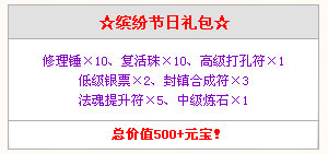 【活動(dòng)內(nèi)容】活動(dòng)期間只要單筆充值達(dá)到500元寶,即可獲得[繽紛節(jié)日禮包]