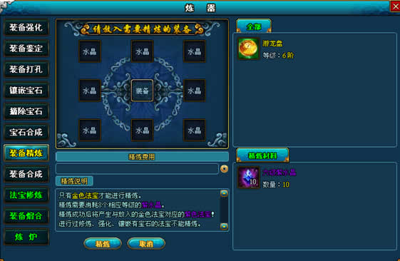 2, 對應(yīng)階數(shù)的金色法寶只能用對應(yīng)級數(shù)的紫水晶進(jìn)行精煉如三級紫水晶只能用于精煉三階金色法寶。精煉界面可從【煉器】中進(jìn)入。