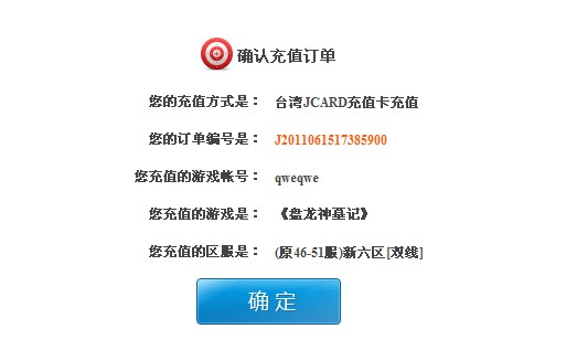 3、上一步確認(rèn)帳號(hào)之后選擇“立即充值”跳轉(zhuǎn)出確認(rèn)充值訂單資訊,您請記錄好您的充值訂單編號(hào)(如果出現(xiàn)充值問題可以憑此訂單號(hào)諮詢有關(guān)服務(wù)人員,客服QQ:919884052 充值客服電話:400-675-8891)。