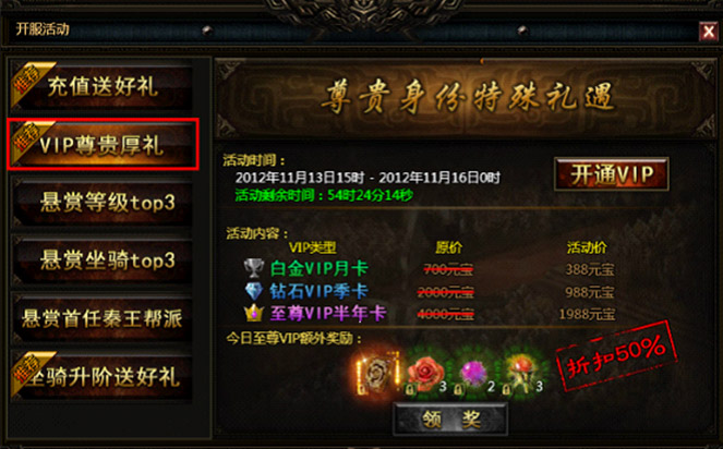 白金VIP月卡 | 活動期間激活可以領(lǐng)取:坐騎進(jìn)階終身免費卡、2紅玫瑰(綁)*3、雙倍收益丹(綁)*2、生命池(綁)*3 | |