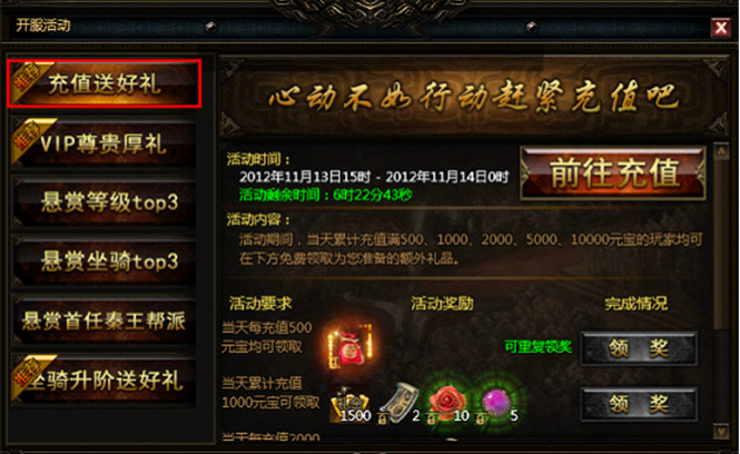 活動(dòng)內(nèi)容:活動(dòng)期間,每日充值都可以獲得我們精心準(zhǔn)備的獲外大禮包,同時(shí)在活動(dòng)期間提升坐騎到一定品階同樣會(huì)有額外大禮?;顒?dòng)詳情請(qǐng)查看游戲內(nèi)"開(kāi)服活動(dòng)"面板。