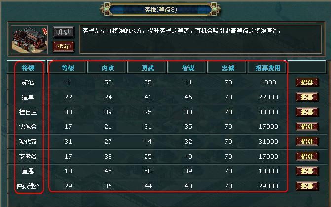 點擊建筑“客棧”進入將領(lǐng)招募界面,可以瀏覽在野將領(lǐng)的屬性及招募費用。
