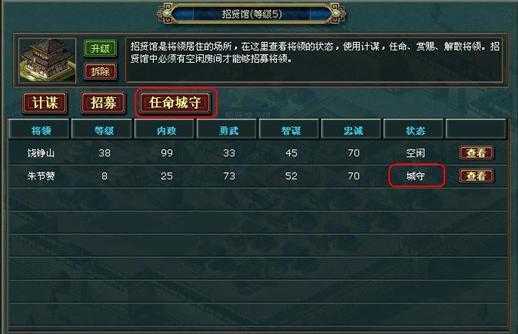 城守:任命為一個城池的城守。城守可以給城池加成,但不能出征。需要解除任命后變成空閑,才能繼續(xù)其他事情。
