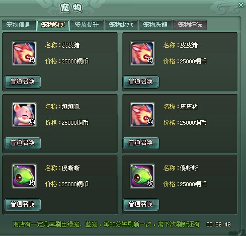 3)在寵物頁面的寵物商店可以購買白色,綠色,藍色的寵物,1小時刷新一次,有幾率刷新綠色和藍色;