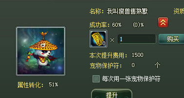 3)資質,資質成長,就會增加寵物原本屬性的轉化率,資質可以使用資質提升符提升寵物屬性的轉化率:資質和強化一樣,有風險,注意使用資質保護符還有資質幸運符,這些東西都可以在商城中購買