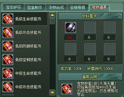 5)技能,寵物技能可以在商城中購買部分低級技能,在神爐中可以用技能殘卷合成低級技能和用相應量的寵物技能書進行書本升級