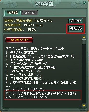 領(lǐng)取方式:在游戲右下角找到“VIP”按鈕,在VIP功能界面上點(diǎn)擊“領(lǐng)取獎(jiǎng)勵(lì)”按鈕領(lǐng)取每日獎(jiǎng)勵(lì)。