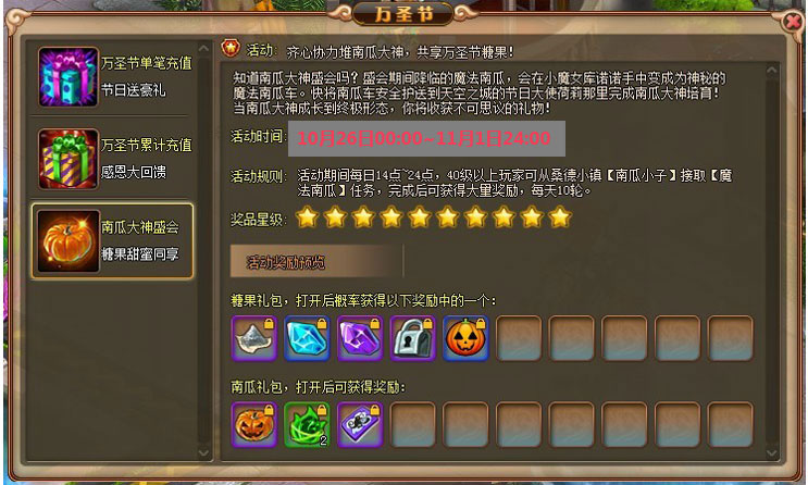 ③ 每次完成[魔法南瓜車]護(hù)送都會(huì)獲得【糖果禮包】,禮包有概率獲得銀星砂,藍(lán)色附魔石,紫色附魔石,附魔鎖,限量版南瓜幻獸的其中一件。